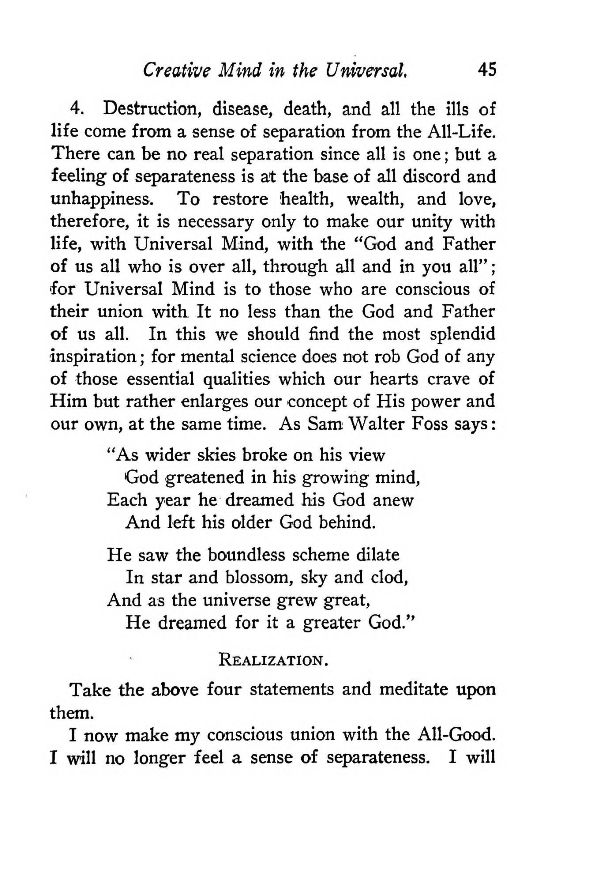 4. Destruction, disease, death, and all the ills of life come from a sense of separation from the All-Life. There can be no real separation since all is one; but a feeling of separateness is at the base of all discord and unhappiness. To restore health, wealth, and love, therefore, it is necessary only to make our unity with life, with Universal Mind, with the "God and Father of us all who is over all, through all and in you all"; for Universal Mind is to those who are conscious of their union with It no less than the God and Father of us all. In this we should find the most splendid inspiration; for mental science does not rob God of any of those essential qualities which our hearts crave of Him but rather enlarges our concept of His power and our own, at the same time. As Sam Walter Foss says: