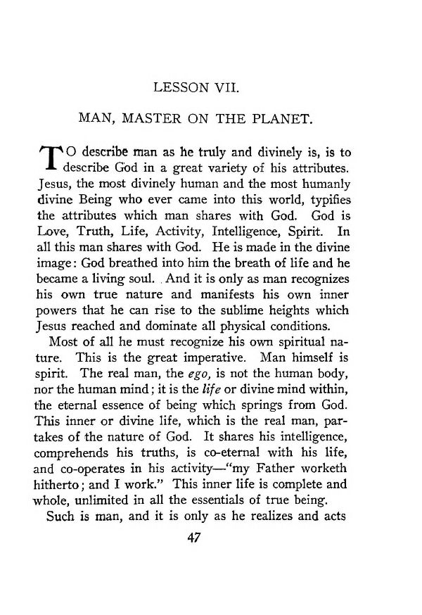 TO describe man as he truly and divinely is, is to describe God in a great variety of his attributes. Jesus, the most divinely human and the most humanly divine Being who ever came into this world, typifies the attributes which man shares with God. God is Love, Truth, Life, Activity, Intelligence, Spirit. In all this man shares with God. He is made in the divine image: God breathed into him the breath of life and he became a living soul. . And it is only as man recognizes his own true nature and manifests his own inner powers that he can rise to the sublime heights which Jesus reached and dominate all physical conditions.
