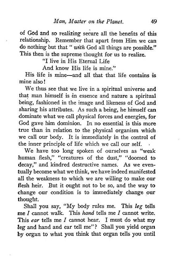 We thus see that we live in a spiritual universe and that man himself is in essence and nature a spiritual being, fashioned in the image and likeness of God and sharing his attributes. As such a being, he himself can dominate what we call physical forces and energies, for God gave him dominion. In no essential is this more true than in relation to the physical organism which we call our body. It is immediately in the control of the inner principle of life which we call our self.