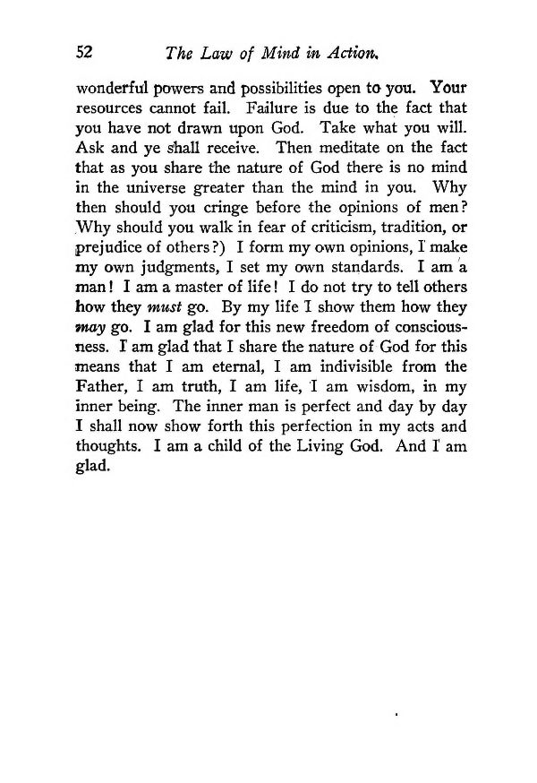 Method of Reading and Study - Metaphysics - The One Law - How to Use the Law - Spirit - Creative Mind in the Individual - Creative Mind in the Universal - Man ~ Master on the Planet - Matter, or Thought in Form - The Creative Word - The Outer and the Inner Universe - The Infinite Self - Law of Attraction - Choosing the Law - Feeling and Emotions - Instinct to Create - Our Immaculate Conceptions - Intensified Consciousness - Is Evil a Power? - The Thing I Fear - Nothing Matters - Courage Regained - Creative Imagination - One-Pointedness - Faith, An Attitude of Mind - Mental Poise - The Will To Win - Creating Atmospheres and Prosperity - The Personal Spirit - Intuition and Ideation - Ultimate Reality & the Fatherhood of God - The Supreme Affirmation - Use of Formulas - How to Help Others - Whom to Treat - How Long to Treat - What Kind of Cases to Be Treated - My Good Night Prayer - Contents -