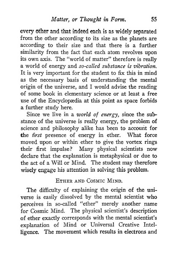 every other and that indeed each is as widely separated from the other according to its size as the planets. are according to their size and that there is a further similarity from the fact that each atom revolves upon its own axis. The "world of matter" therefore is really a world of energy and so-called substance is vibration. It is very important for the student to fix this in mind as the necessary basis of understanding the mental origin of the universe, and I would advise the reading of some book in elementary science or at least a free use of the Encyclopaedia at this point as space forbids a further study here.