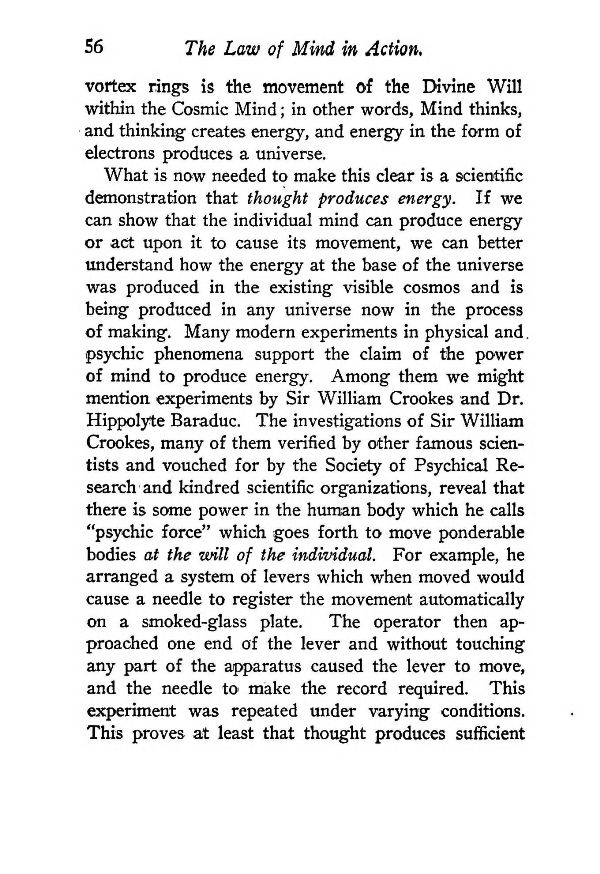 What is now needed to make this clear is a scientific demonstration that thought produces energy. If we can show that the individual mind can produce energy or act upon it to cause its movement, we can better understand how the energy at the base of the universe was produced in the existing visible cosmos and is being produced in any universe now in the process of making. Many modern experiments in physical and . psychic phenomena support the claim of the power of mind to produce energy. Among them we might mention experiments by Sir William Crookes and Dr. Hippolyte Baraduc. The investigations of Sir William Crookes, many of them verified by other famous scientists and vouched for by the Society of Psychical Research and kindred scientific organizations, reveal that there is some power in the human body which he calls "psychic force" which goes forth to move ponderable bodies at the will of the individual. For example, he arranged a system of levers which when moved would cause a needle to register the movement automatically on a smoked-glass plate. The operator then approached one end of the lever and without touching any part of the apparatus caused the lever to move, and the needle to make the record required. This experiment was repeated under varying conditions. This proves at least that thought produces sufficient