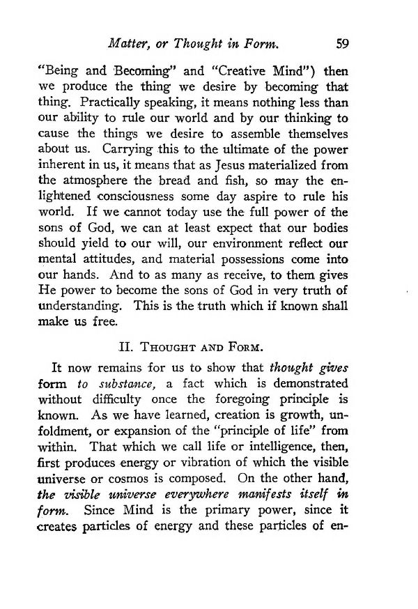 It now remains for us to show that thought gives form to substance, a fact which is demonstrated without difficulty once the foregoing principle is known. As we have learned, creation is growth, unfoldment, or expansion of the "principle of life" from within. That which we call life or intelligence, then, first produces energy or vibration of which the visible universe or cosmos is composed. On the other hand, the visible universe everywhere manifests itself in form. Since Mind is the primary power, since it creates particles of energy and these particles of energy