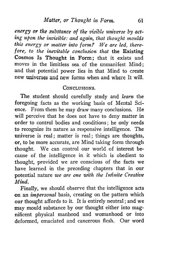 The student should carefully study and learn the foregoing facts as the working basis of Mental Science. From them he may draw many conclusions. He will perceive that he does not have to deny matter in order to control bodies and conditions; he only needs to recognize its nature as responsive intelligence. The universe is real; matter is real; things are thoughts, or, to be more accurate, are Mind taking form through thought. We can control our world of interest because of the intelligence in it which is obedient to thought, provided we are conscious of the facts we have learned in the preceding chapters that in our potential nature we are one with the Infinite Creative Mind.