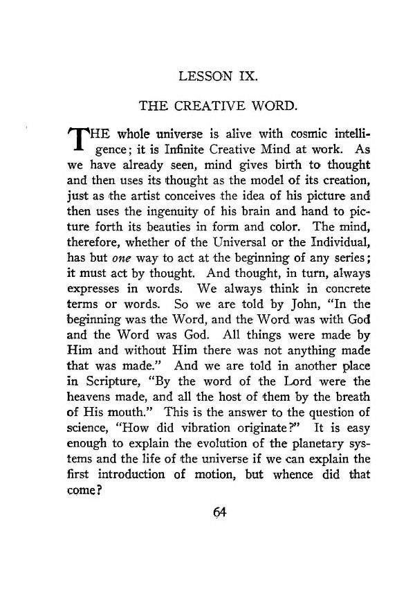 THE whole universe is alive with cosmic intelligence; it is Infinite Creative Mind at work. As we have already seen, mind gives birth to thought and then uses its thought as the model of its creation, just as the artist conceives the idea of his picture and then uses the ingenuity of his brain and hand to picture forth its beauties in form and color. The mind, therefore, whether of the Universal or the Individual, has but one way to act at the beginning of any series; it must act by thought. And thought, in turn, always expresses in words. We always think in concrete terms or words. So we are told by John, "In the beginning was the Word, and the Word was with God and the Word was God. All things were made by Him and without Him there was not anything made that was made." And we are told in another place in Scripture, "By the word of the Lord were the heavens made, and all the host of them by the breath of His mouth." This is the answer to the question of science, "How did vibration originate?" It is easy enough to explain the evolution of the planetary systems and the life of the universe if we can explain the first introduction of motion, but whence did that come?