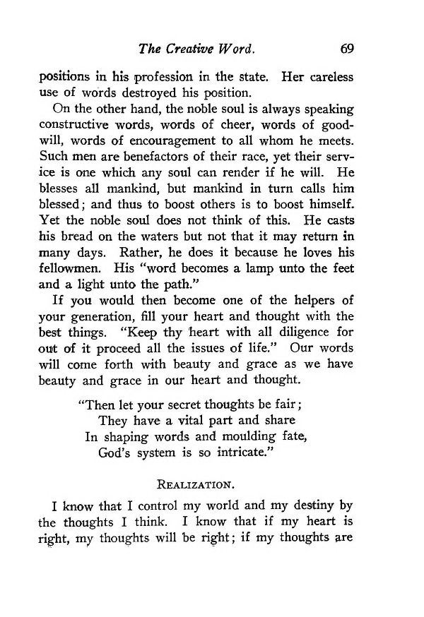 "Then let your secret thoughts be fair; They have a vital part and share In shaping words and moulding fate, God's system is so intricate."