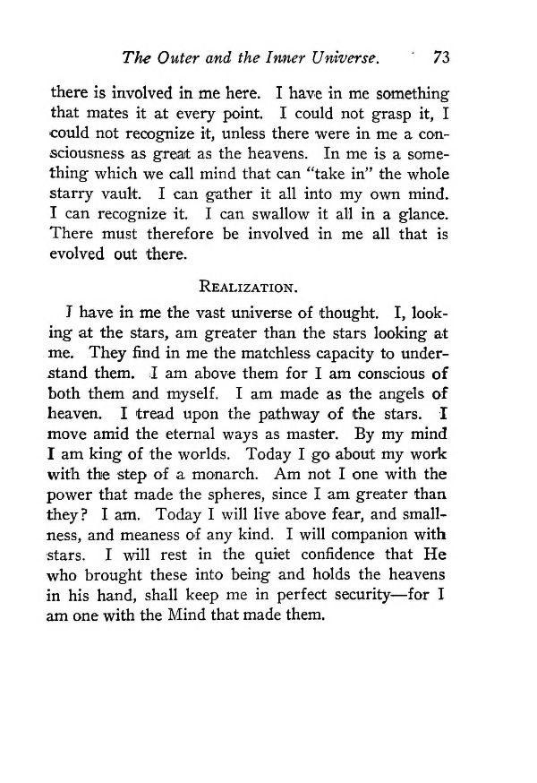 I have in me the vast universe of thought. I, looking at the stars, am greater than the stars looking at me. They find in me the matchless capacity to understand them. I am above them for I am conscious of both them and myself. I am made as the angels of heaven. I tread upon the pathway of the stars. I move amid the eternal ways as master. By my mind I am king of the worlds. Today I go about my world with the step of a monarch. Am not I one with the power that made the spheres, since I am greater than they? I am. Today I will live above fear, and smallness, and meanness of any kind. I will companion with stars. I will rest in the quiet confidence that He who brought these into being and holds the heavens in his hand, shall keep me in perfect security — for I am one with the Mind that made them.