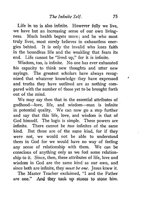 We may say then that in the essential attributes of godhood — love, life, and wisdom — man is infinite in potential quality. We can now go a step further and say that this life, love, and wisdom is that of God himself. The logic is simple. These powers are infinite. There cannot be two infinites of the same kind. But these are of the same kind, for if they were not, we would not be able to understand them in God for we would have no way of feeling any sense of relationship with them. We can be conscious of anything only as we feel some relationship to it. Since, then, these attributes of life, love and wisdom in God are the same kind as our own, and since both are infinite, they must be one. Jesus knew it.