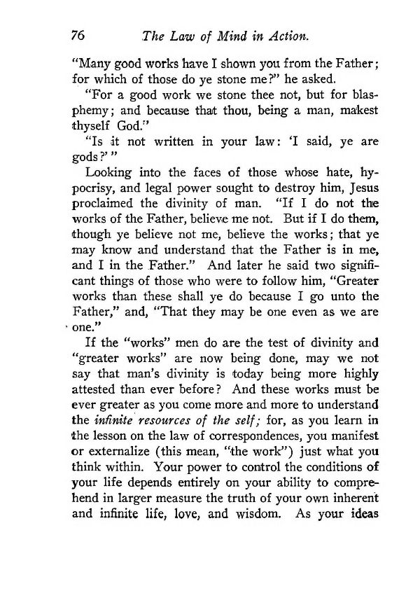 If the "works" men do are the test of divinity and "greater works" are now being done, may we not say that man's divinity is today being more highly attested than ever before? And these works must be ever greater as you come more and more to understand the infinite resources of the self; for, as you learn in the lesson on the law of correspondences, you manifest or externalize (this mean, "the work") just what you think within. Your power to control the conditions of your life depends entirely on your ability to comprehend in larger measure the truth of your own inherent and infinite life, love, and wisdom. As your ideas