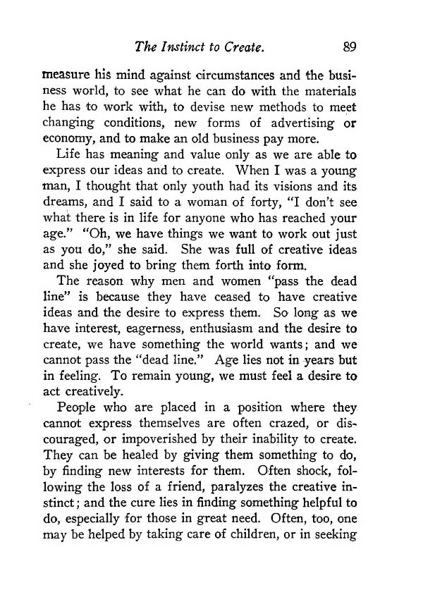 The reason why men and women "pass the dead line" is because they have ceased to have creative ideas and the desire to express them. So long as we have interest, eagerness, enthusiasm and the desire to create, we have something the world wants; and we cannot pass the "dead line." Age lies not in years but in feeling. To remain young, we must feel a desire to act creatively.