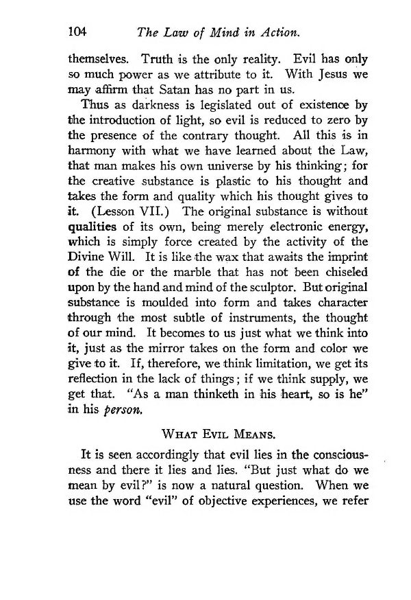 Thus as darkness is legislated out of existence by the introduction of light, so evil is reduced to zero by the presence of the contrary thought. All this is in harmony with what we have learned about the Law, that man makes his own universe by his thinking; for the creative substance is plastic to his thought and takes the form and quality which his thought gives to it. (Lesson VII.) The original substance is without qualities of its own, being merely electronic energy, which is simply force created by the activity of the Divine Will. It is like the wax that awaits the imprint of the die or the marble that has not been chiseled upon by the hand and mind of the sculptor. But original substance is moulded into form and takes character through the most subtle of instruments, the thought of our mind. It becomes to us just what we think into it, just as the mirror takes on the form and color we give to it. If, therefore, we think limitation, we get its reflection in the lack of things; if we think supply, we get that. "As a man thinketh in his heart, so is he" in his person.
