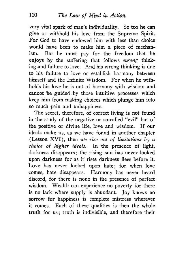 The secret, therefore, of correct living is not found in the study of the negative or so-called "evil" but of the positive or divine life, love and wisdom. If our ideals make us, as we have found in another chapter (Lesson XVI), then we rise out of limitations by a choice of higher ideals. In the presence of light, darkness disappears; the rising sun has never looked upon darkness for as it' rises darkness flees before it. Love has never looked upon hate; for when love comes, hate disappears. Harmony has never heard discord,, for there is none in the presence of perfect wisdom. Wealth can experience no poverty for there is no lack where supply is abundant. Joy knows no sorrow for happiness is complete mistress wherever it comes. Each of these qualities is then the whole truth for us; truth is indivisible, and therefore their
