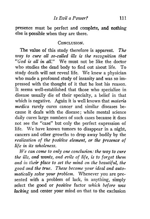 The value of this study therefore is apparent. The way to cure all so-called ills is the recognition that "God is all in all." We must not be like the doctor who studies the dead body to find out about life. To study death will not reveal life. We knew a physician who made a profound study of insanity and was so impressed with the thought of it that he lost his reason. "It seems well-established that those who specialize in disease usually die of their specialty, a belief in that which is negative. Again it is well known that materia medica rarely cures cancer and similar diseases because it deals with the disease; while mental science daily cures large numbers of such cases because it does not see the "case" but only the perfect expression of life. We have known tumors to disappear in a night, cancers and other growths to drop away bodily by the realization of the positive element, or the presence of life in its wholeness.