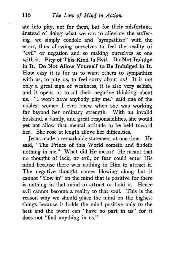 into pity, not for them, but for their misfortune. Instead of doing what we can to alleviate the suffering, we simply condole and "sympathize" with the error, thus allowing ourselves to feel the reality of "evil" or negation and so making ourselves at one with it. Pity of This Kind Is Evil. Do Not Indulge in It. Do Not Allow Yourself to Be Indulged in It. How easy it is for us to want others to sympathize with us, to pity us, to feel sorry about us! It is not only a great sign of weakness, it is also very selfish, and it opens us to all their negative thinking -about us. "I won't have anybody pity me," said one of the noblest women I ever knew when she was working far beyond her ordinary strength. With an invalid husband, a family, and great responsibilities, she would yet not allow that mental attitude to be held toward her. She rose at length above her difficulties.
