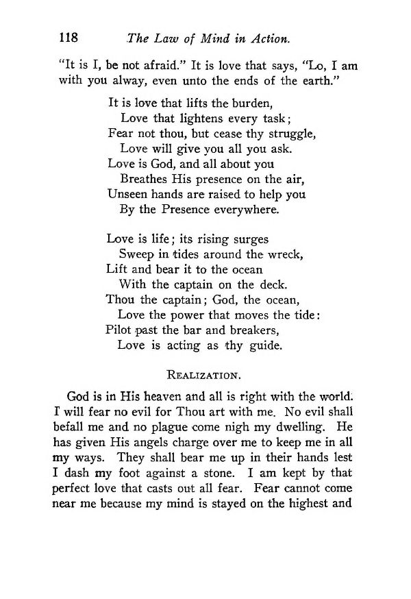 Method of Reading and Study - Metaphysics - The One Law - How to Use the Law - Spirit - Creative Mind in the Individual - Creative Mind in the Universal - Man ~ Master on the Planet - Matter, or Thought in Form - The Creative Word - The Outer and the Inner Universe - The Infinite Self - Law of Attraction - Choosing the Law - Feeling and Emotions - Instinct to Create - Our Immaculate Conceptions - Intensified Consciousness - Is Evil a Power? - The Thing I Fear - Nothing Matters - Courage Regained - Creative Imagination - One-Pointedness - Faith, An Attitude of Mind - Mental Poise - The Will To Win - Creating Atmospheres and Prosperity - The Personal Spirit - Intuition and Ideation - Ultimate Reality & the Fatherhood of God - The Supreme Affirmation - Use of Formulas - How to Help Others - Whom to Treat - How Long to Treat - What Kind of Cases to Be Treated - My Good Night Prayer - Contents -