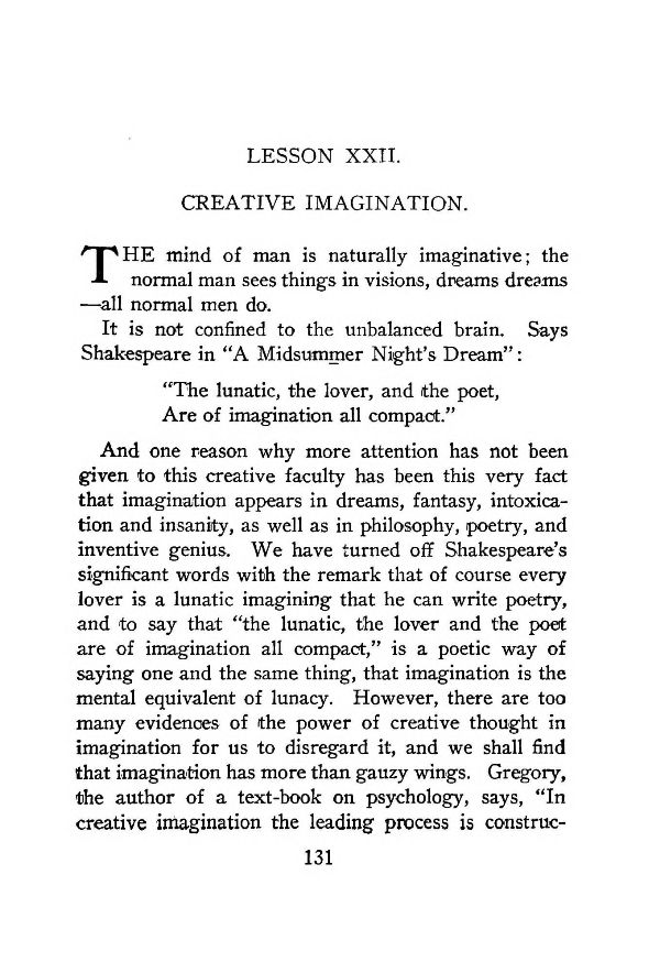And one reason why more attention has not been given to this creative faculty has been this very fact that imagination appears in dreams, fantasy, intoxication and insanity, as well as in philosophy, poetry, and inventive genius. We have turned off Shakespeare's significant words with the remark that of course every lover is a lunatic imagining that he can write poetry, and to say that "the lunatic, the lover and the poet are of imagination all compact," is a poetic way of saying one and the same thing, that imagination is the mental equivalent of lunacy. However, there are too many evidences of the power of creative thought in imagination for us to disregard it, and we shall find that imagination has more than gauzy wings. Gregory, the author of a text-book on psychology, says, "In creative imagination the leading process is construction