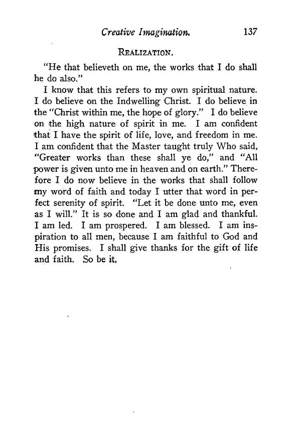 I know that this refers to my own spiritual nature. I do believe on the Indwelling Christ. I do believe in the "Christ within me, the hope of glory." I do believe on the high nature of spirit in me. I am confident that I have the spirit of life, love, and freedom in me. I am confident that the Master taught truly Who said, "Greater works than these shall ye do," and "All power is given unto me in heaven and on earth." Therefore I do now believe in the works that shall follow my word of faith and today I utter that word in perfect serenity of spirit. "Let it be done unto me, even as I will." It is so done and I am glad and thankful. I am led. I am prospered. I am blessed. I am inspiration to all men, because I am faithful to God and His promises. I shall give thanks for the gift of life and faith. So be it,