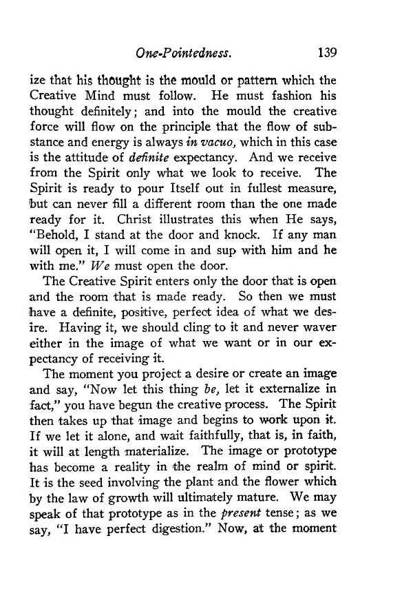 that his thought is the mould or pattern which the Creative Mind must follow. He must fashion his thought definitely; and into the mould the creative force will flow on the principle that the flow of substance and energy is always in vacuo, which in this case is the attitude of definite expectancy. And we receive from the Spirit only what we look to receive. The Spirit is ready to pour Itself out in fullest measure, but can never fill a different room than the one made ready for it. Christ illustrates this when He says, "Behold, I stand at the door and knock. If any man will open it, I will come in and sup with him and he with me." We must open the door.