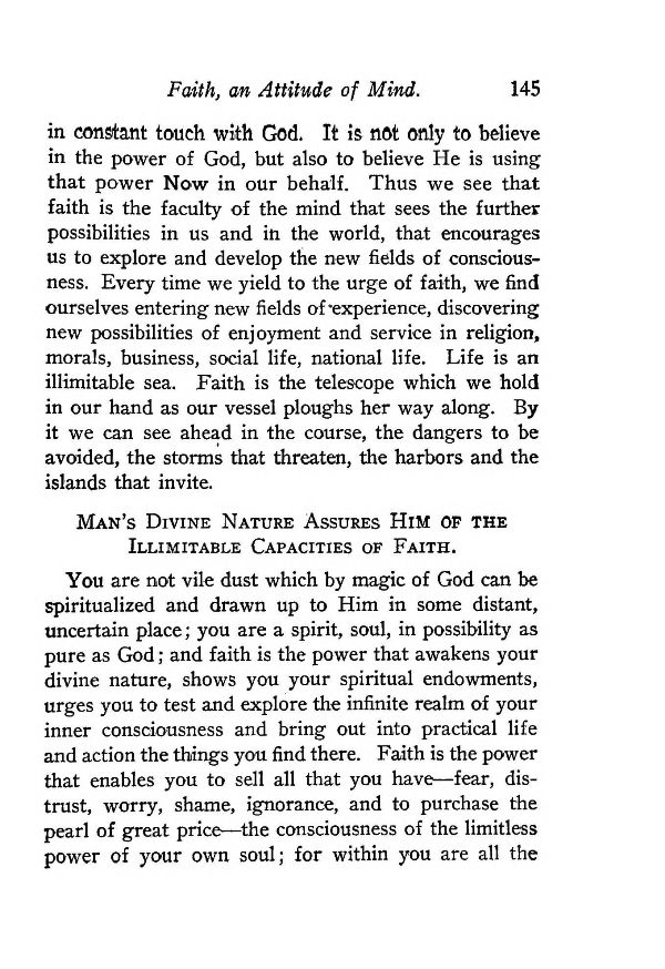 in constant touch with God. It is not only to believe in the power of God, but also to believe He is using that power Now in our behalf. Thus we see that faith is the faculty of the mind that sees the further possibilities in us and in the world, that encourages us to explore and develop the new fields of consciousness. Every time we yield to the urge of faith, we find ourselves entering new fields of 'experience, discovering new possibilities of enjoyment and service in religion, morals, business, social life, national life. Life is an illimitable sea. Faith is the telescope which we hold in our hand as our vessel ploughs her way along. By it we can see ahead in the course, the dangers to be avoided, the storms that threaten, the harbors and the islands that invite.