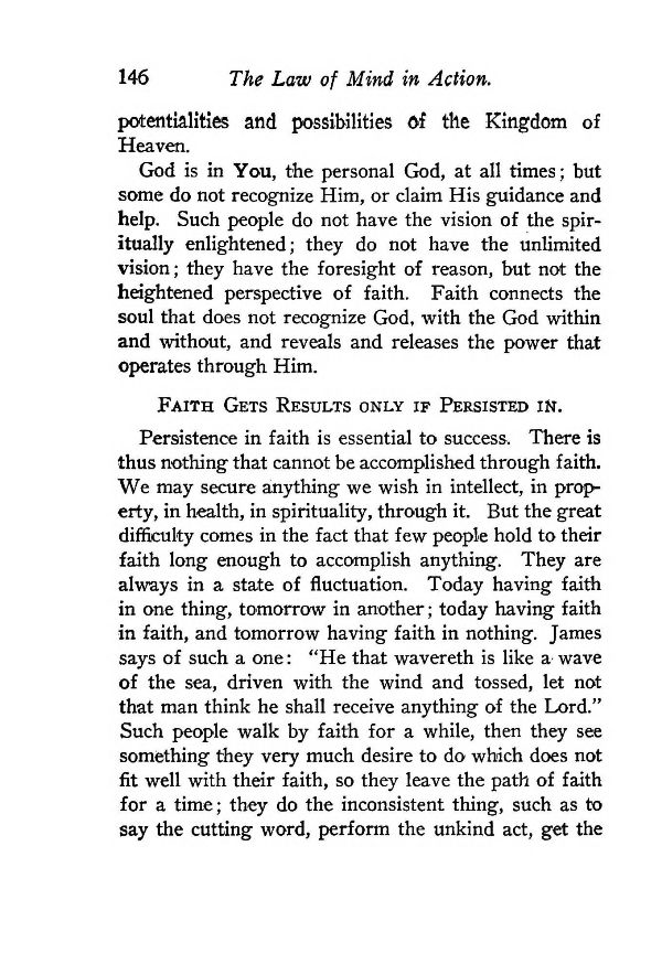 Persistence in faith is essential to success. There is thus nothing that cannot be accomplished through faith. We may secure anything we wish in intellect, in property, in health, in spirituality, through it. But the great difficulty comes in the fact that few people hold to their faith long enough to accomplish anything. They are always in a state of fluctuation. Today having faith in one thing, tomorrow in another; today having faith in faith, and tomorrow having faith in nothing. James says of such a one: "He that wavereth is like a wave of the sea, driven with the wind and tossed, let not that man think he shall receive anything of the Lord." Such people walk by faith for a while, then they see something they very much desire to do which does not fit well with their faith, so they leave the path of faith for a time; they do the inconsistent thing, such as to say the cutting word, perform the unkind act, get the