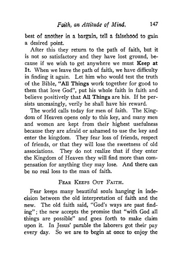 After this they return to the path of faith, but it is not so satisfactory and they have lost ground, because if we wish to get anywhere we must Keep at It. When we leave the path of faith, we have difficulty in finding it again. Let him who would test the truth of the Bible, "All Things work together for good to them that love God", put his whole faith in faith and believe positively that All Things are his. If he persists unceasingly, verily he shall have his reward.