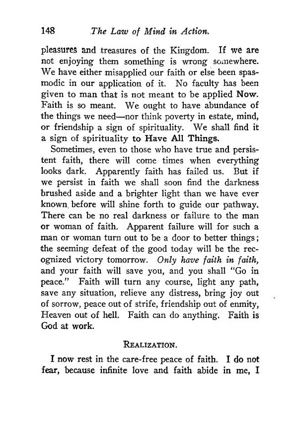 pleasures and treasures of the Kingdom. If we are not enjoying them something is wrong somewhere. We have either misapplied our faith or else been spasmodic in our application of it. No faculty has been given to man that is not meant to be applied Now. Faith is so meant. We ought to have abundance of the things we need — nor think poverty in estate, mind, or friendship a sign of spirituality. We shall find it a sign of spirituality to Have All Things.