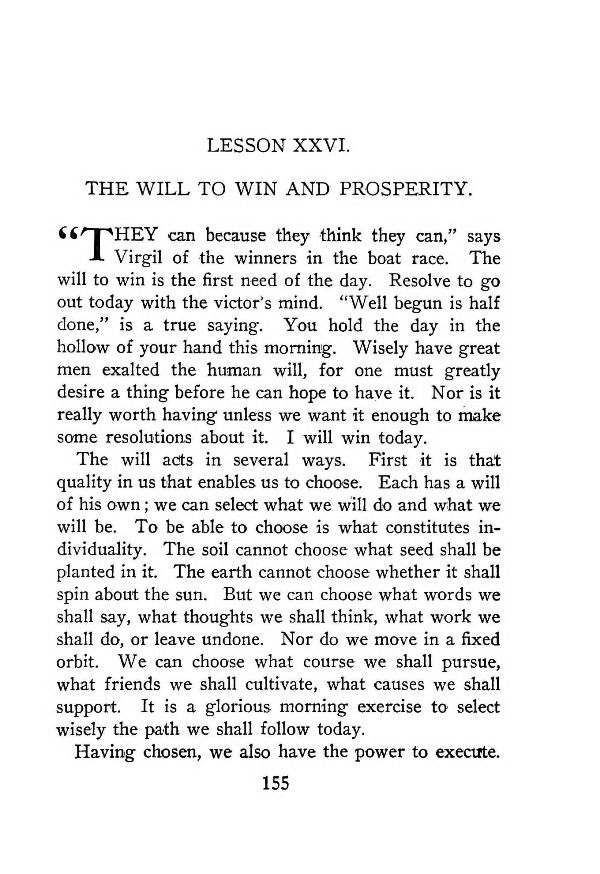 "THEY can because they think they can," says Virgil of the winners in the boat race. The will to win is the first need of the day. Resolve to go out today with the victor's mind. "Well begun is half done," is a true saying. You hold the day in the hollow of your hand this morning. Wisely have great men exalted the human will, for one must greatly desire a thing before he can hope to haye it. Nor is it really worth having" unless we want it enough to make some resolutions about it. I will win today.