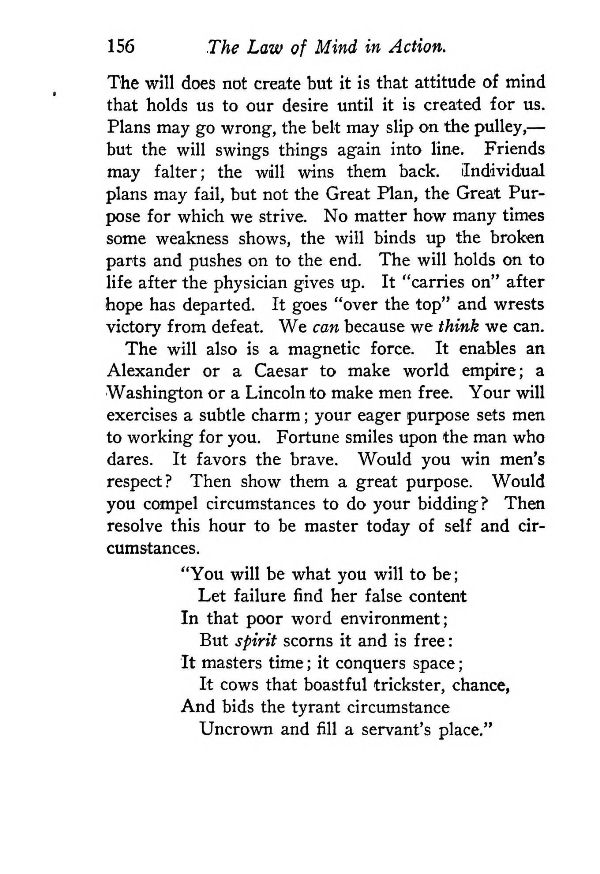 The will does not create but it is that attitude of mind that holds us to our desire until it is created for us. Plans may go wrong, the belt may slip on the pulley, — but the will swings things again into line. Friends may falter; the will wins them back. Individual plans may fail, but not the Great Plan, the Great Purpose for which we strive. No matter how many times some weakness shows, the will binds up the broken parts and pushes on to the end. The will holds on to life after the physician gives up. It "carries on" after hope has departed. It goes "over the top" and wrests victory from defeat. We can because we think we can. The will also is a magnetic force. It enables an Alexander or a Caesar to make world empire; a Washington or a Lincoln to make men free. Your will exercises a subtle charm; your eager purpose sets men to working for you. Fortune smiles upon the man who dares. It favors the brave. Would you win men's respect? Then show them a great purpose. Would you compel circumstances to do your bidding? Then resolve this hour to be master today of self and circumstances.