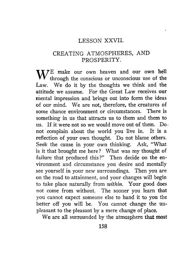WE make our own heaven and our own hell through the conscious or unconscious use of the Law. We do it by the thoughts we think and the attitude we assume. For the Great Law receives our mental impression and brings out into form the ideas of our mind. We are not, therefore, the creatures of some chance environment or circumstances. There is something in us that attracts us to them and them to us. If it were not so we would move out of them. Do not complain about the world you live in. It is a reflection of your own thought. Do not blame others. Seek the cause in your own thinking. Ask, "What is it that brought me here ? What was my thought of failure that produced this?" Then decide on the environment and circumstance you desire and mentally see yourself in your new surroundings. Then you are on the road to attainment, and your changes will begin to take place naturally from within. Your good does not come from without. The sooner you learn that you cannot expect someone else to hand it to you the better off you will be. You cannot change the unpleasant to the pleasant by a mere change of place. We are all surrounded by the atmosphere that most