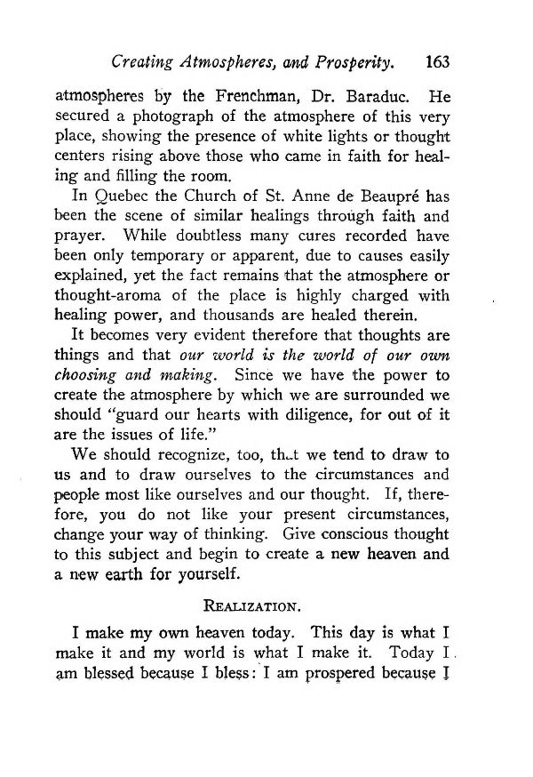 In Quebec the Church of St. Anne de Beaupre has been the scene of similar healings through faith and prayer. While doubtless many cures recorded have been only temporary or apparent, due to causes easily explained, yet the fact remains that the atmosphere or thought-aroma of the place is highly charged with healing power, and thousands are healed therein.