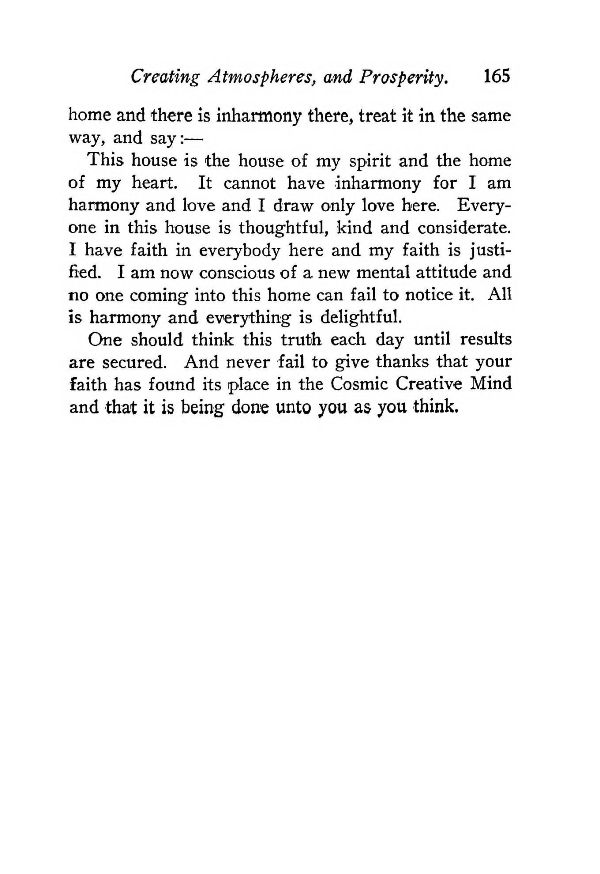 This house is the house of my spirit and the home of my heart. It cannot have inharmony for I am harmony and love and I draw only love here. Everyone in this house is thoughtful, kind and considerate. I have faith in everybody here and my faith is justified. I am now conscious of a new mental attitude and no one coming into this home can fail to notice it. All is harmony and everything is delightful.
