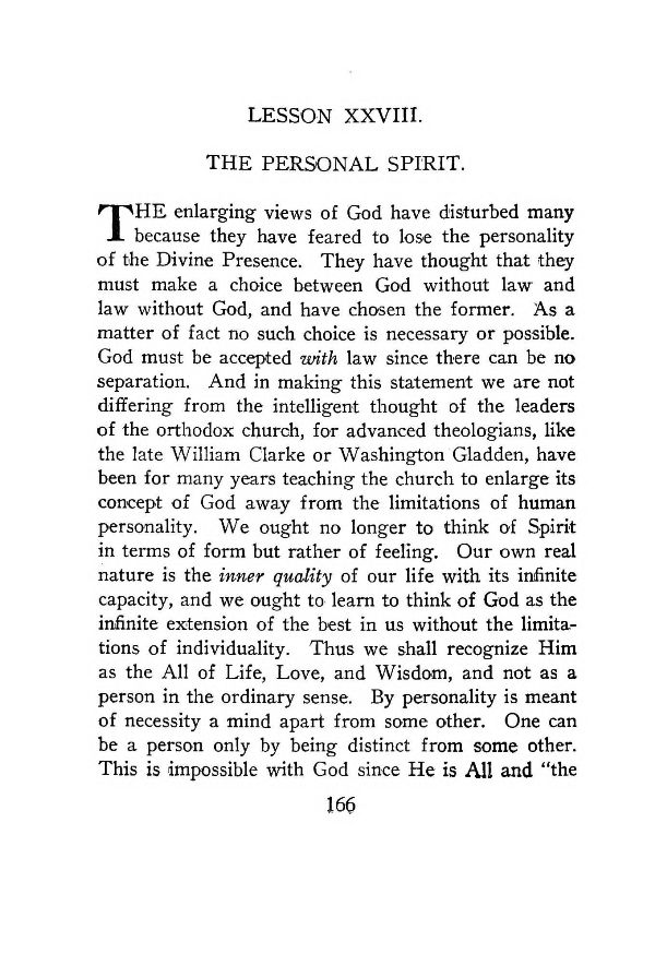 THE enlarging views of God have disturbed many because they have feared to lose the personality of the Divine Presence. They have thought that they must make a choice between God without law and law without God, and have chosen the former. As a matter of fact no such choice is necessary or possible. God must be accepted with law since there can be no separation. And in making this statement we are not differing from the intelligent thought of the leaders of the orthodox church, for advanced theologians, like the late William Clarke or Washington Gladden, have been for many years teaching the church to enlarge its concept of God away from the limitations of human personality. We ought no longer to think of Spirit in terms of form but rather of feeling. Our own real nature is the inner quality of our life with its infinite capacity, and we ought to learn to think of God as the infinite extension of the best in us without the limitations of individuality. Thus we shall recognize Him as the All of Life, Love, and Wisdom, and not as a person in the ordinary sense. By personality is meant of necessity a mind apart from some other. One can be a person only by being distinct from some other. This is impossible with God since He is All and "the