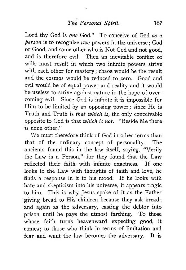 Lord thy God is one God." To conceive of God as a person is to recognize two powers in the universe; God or Good, and some other who is Not God and not good, and is therefore evil. Then an inevitable conflict of wills must result in which two infinite powers strive with each other for mastery; chaos would be the result and the cosmos would be reduced to zero. Good and evil would be of equal power and reality and it would be useless to strive against nature in the hope of overcoming evil. Since God is infinite it is impossible for Him to be limited by an opposing power; since He is Truth and Truth is that which is, the only conceivable opposite to God is that which is not. "Beside Me there is none other."