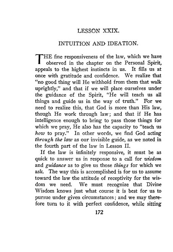 THE fine responsiveness of the law, which we have observed in the chapter on the Personal Spirit, appeals to the highest instincts in us. It fills us at once with gratitude and confidence. We realize that "no good thing will He withhold from them that walk uprightly," and that if we will place ourselves under the guidance of the Spirit, "He will teach us all things and guide us in the way of truth." For we need to realize this, that God is more than His law, though He work through law; and that if He has intelligence enough to bring to pass those things for which we pray, He also has the capacity to "teach us how to pray." In other words, we find God acting through the law as our invisible guide, as we noted in the fourth part of the law in Lesson II.