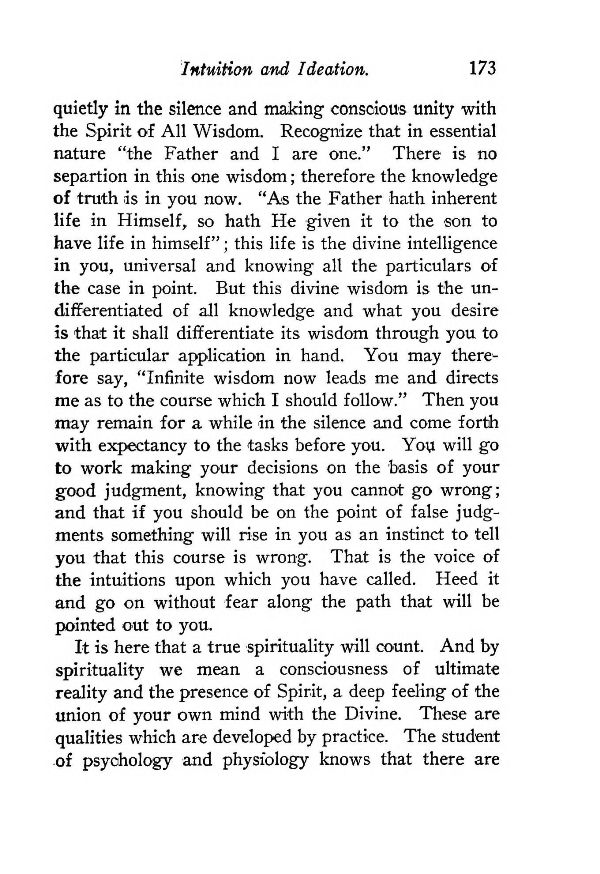 quietly in the silence and making conscious unity with the Spirit of All Wisdom. Recognize that in essential nature "the Father and I are one." There is no separation in this one wisdom; therefore the knowledge of truth is in you now. "As the Father hath inherent life in Himself, so hath He given it to the son to have life in himself"; this life is the divine intelligence in you, universal and knowing all the particulars of the case in point. But this divine wisdom is the undifferentiated of all knowledge and what you desire is that it shall differentiate its wisdom through you to the particular application in hand. You may therefore say, "Infinite wisdom now leads me and directs me as to the course which I should follow." Then you may remain for a while in the silence and come forth with expectancy to the tasks before you. You will go to work making your decisions on the basis of your good judgment, knowing that you cannot go wrong; and that if you should be on the point of false judgments something will rise in you as an instinct to tell you that this course is wrong. That is the voice of the intuitions upon which you have called. Heed it and go on without fear along the path that will be pointed out to you.