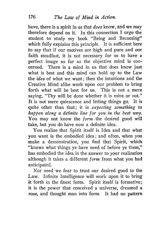 have, there is a spirit in us that does know, and we may therefore depend on it. In this connection I urge the student to study my book "Being and Becoming" which fully explains this principle. It is sufficient here to say that if our motives are high and pure and our faith steadfast, it is not necessary for us to have a perfect image so far as the objective mind is concerned. There is a mind in us that does know just what is best and this mind can hold up to the Law the idea of what we want; then the intuitions and the Creative Mind alike work upon our problem to bring forth what will be best for us. This is not a mere saying, "Thy will be done whether it is mine or not."' It is not mere quiescence and letting things go. It is quite other than that; it is expecting something to happen along a definite line for you in the best may. You may not know the form- the desired good will take, but you do have now a definite idea.