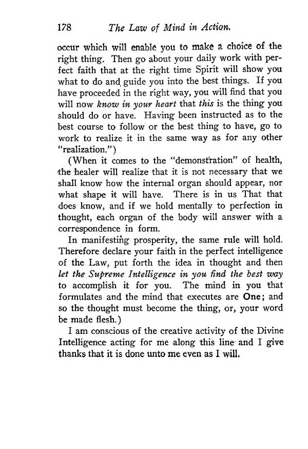 In manifesting prosperity, the same rule will hold. Therefore declare your faith in the perfect intelligence of the Law, put forth the idea in thought and then let the Supreme Intelligence in you find the best way to accomplish it for you. The mind in you that formulates and the mind that executes are One; and so the thought must become the thing, or, your word be made flesh.)