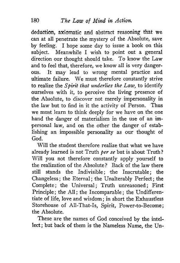 deduction, axiomatic and abstract reasoning that we can at all penetrate the mystery of the Absolute, save by feeling. I hope some day to issue a book on this subject. Meanwhile I wish to point out a general direction our thought should take. To know the Law and to feel that, therefore, we know all is very dangerous. It may lead to wrong mental practice and ultimate failure. We must therefore constantly strive to realize the Spirit that underlies the Law, to identify ourselves with it, to perceive the living presence of the Absolute, to discover not merely impersonality in the law but to find in it the activity of Person. Thus we must learn to think deeply for we have on the one hand the danger of materialism in the use of an impersonal law, and on the other the danger of establishing an impossible personality as our thought of God.