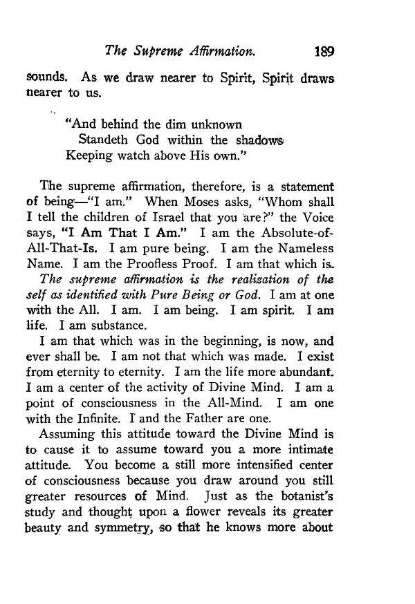 The supreme affirmation is the realization of the self as identified with Pure Being or God. I am at one with the All. I am. I am being. I am spirit. I am life. I am substance.