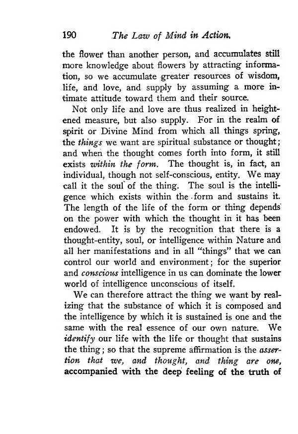 Not only life and love are thus realized in heightened measure, but also supply. For in the realm of spirit or Divine Mind from which all things spring, the things we want are spiritual substance or thought; and when the thought comes forth into form, it still exists within the form. The thought is, in fact, an individual, though not self-conscious, entity. We may call it the soul of the thing. The soul is the intelligence which exists within the form and sustains it. The length of the life of the form or thing depends" on the power with which the thought in it has been endowed. It is by the recognition that there is a thought-entity, soul, or intelligence within Nature and all her manifestations and in all "things" that we can control our world and environment; for the superior and conscious intelligence in us can dominate the lower world of intelligence unconscious of itself.