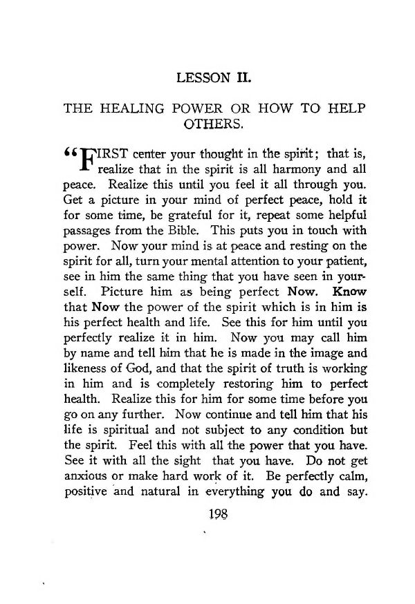 "FIRST center your thought in the spirit; that is, realize that in the spirit is all harmony and all peace. Realize this until you feel it all through you. Get a picture in your mind of perfect peace, hold it for some time, be grateful for it, repeat some helpful passages from the Bible. This puts you in touch with power. Now your mind is at peace and resting on the spirit for all, turn your mental attention to your patient, see in him the same thing that you have seen in yourself. Picture him as being perfect Now. Know that Now the power of the spirit which is in him is his perfect health and life. See this for him until you perfectly realize it in him. Now you may call him by name and tell him that he is made in the image and likeness of God, and that the spirit of truth is working in him and is completely restoring him to perfect health. Realize this for him for some time before you go on any further. Now continue and tell him that his life is spiritual and not subject to any condition but the spirit. Feel this with all the power that you have. See it with all the sight that you have. Do not get anxious or make hard work of it. Be perfectly calm, positive and natural in everything you do and say.
