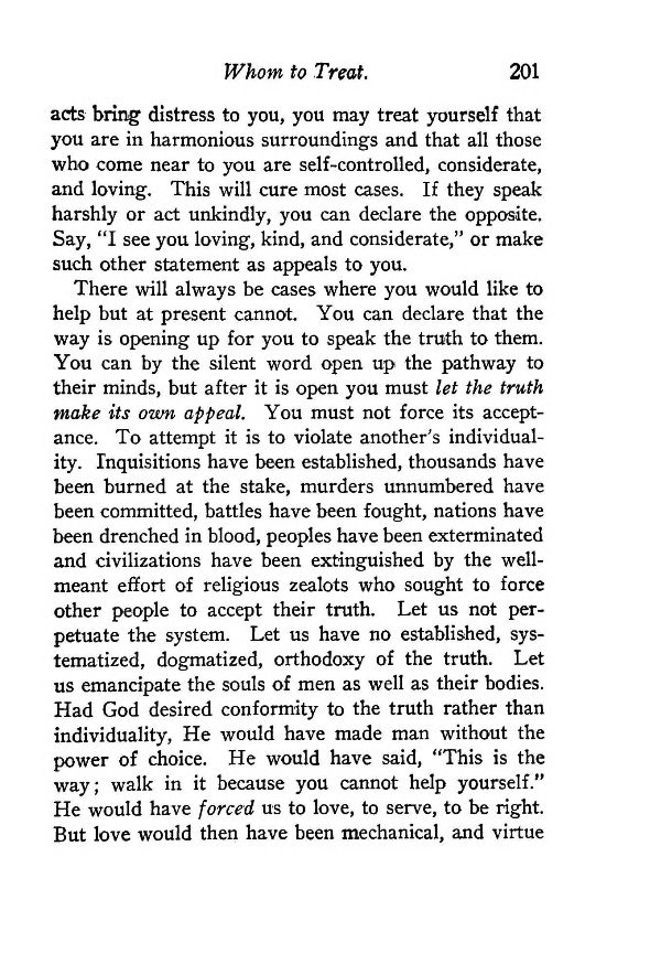 There will always be cases where you would like to help but at present cannot. You can declare that the way is opening up for you to speak the truth to them. You can by the silent word open up the pathway to their minds, but after it is open you must let the truth make its own appeal. You must not force its acceptance. To attempt it is to violate another's individuality. Inquisitions have been established, thousands have been burned at the stake, murders unnumbered have been committed, battles have been fought, nations have been drenched in blood, peoples have been exterminated and civilizations have been extinguished by the well meant effort of religious zealots who sought to force other people to accept their truth. Let us not perpetuate the system. Let us have no established, systematized, dogmatized, orthodoxy of the truth. Let us emancipate the souls of men as well as their bodies. Had God desired conformity to the truth rather than individuality. He would have made man without the power of choice. He would have said, "This is the way; walk in it because you cannot help yourself." He would have forced us to love, to serve, to be right. But love would then have been mechanical, and virtue