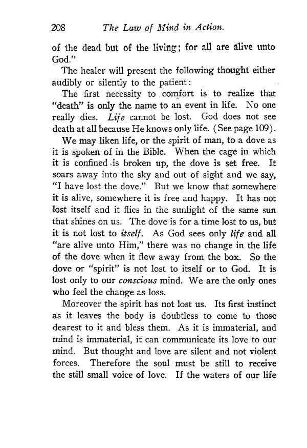 We may liken life, or the spirit of man, to a dove as it is spoken of in the Bible. When the cage in which it is confined .is broken up, the dove is set free. It soars away into the sky and out of sight and we say, "I have lost the dove." But we know that somewhere it is alive, somewhere it is free and happy. It has not lost itself and it flies in the sunlight of the same sun that shines on us. The dove is for a time lost to us, but it is not lost to itself. As God sees only life and all "are alive unto Him," there was no change in the life of the dove when it flew away from the box. So the dove or "spirit" is not lost to itself or to God. It is lost only to our conscious mind. We are the only ones who feel the change as loss.