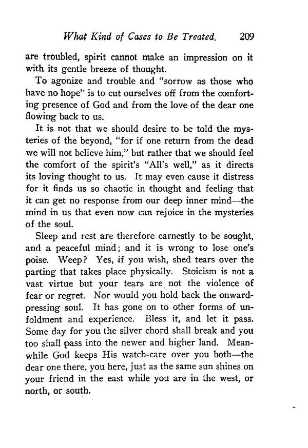 Sleep and rest are therefore earnestly to be sought, and a peaceful mind; and it is wrong to lose one's poise. Weep? Yes, if you wish, shed tears over the parting that takes place physically. Stoicism is not a vast virtue but your tears are not the violence of fear or regret. Nor would you hold back the onward pressing soul. It has gone on to other forms of unfoldment and experience. Bless it, and let it pass. Some day for you the silver chord shall break and you too shall pass into the newer and higher land. Meanwhile God keeps His watch-care over you both — the dear one there, you here, just as the same sun shines on your friend in the east while you are in the west, or north, or south.
