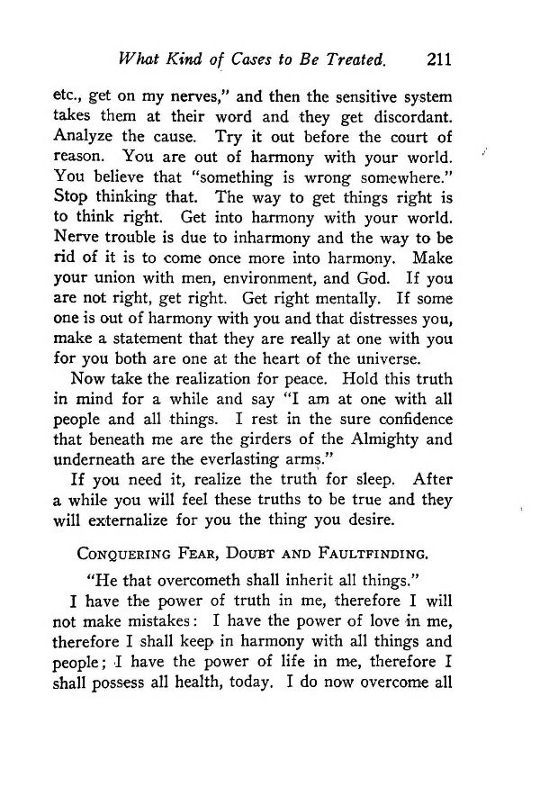 etc., get on my nerves," and then the sensitive system takes them at their word and they get discordant. Analyze the cause. Try it out before the court of reason. You are out of harmony with your world. You believe that "something is wrong somewhere." Stop thinking that. The way to get things right is to think right. Get into harmony with your world. Nerve trouble is due to inharmony and the way to be rid of it is to come once more into harmony. Make your union with men, environment, and God. If you are not right, get right. Get right mentally. If some one is out of harmony with you and that distresses you, make a statement that they are really at one with you for you both are one at the heart of the universe.