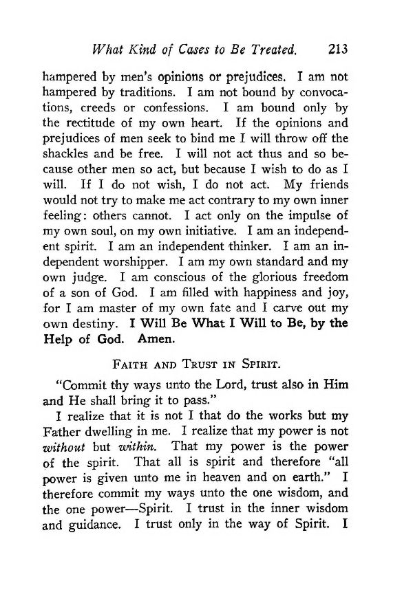 hampered by men's opinions or prejudices. I am not hampered by traditions. I am not bound by convocations, creeds or confessions. I am bound only by the rectitude of my own heart. If the opinions and prejudices of men seek to bind me I will throw off the shackles and be free. I will not act thus and so because other men so act, but because I wish to do as I will. If I do not wish, I do not act. My friends would not try to make me act contrary to my own inner feeling: others cannot. I act only on the impulse of my own soul, on my own initiative. I am an independent spirit. I am an independent thinker. I am an independent worshipper. I am my own standard and my own judge. I am conscious of the glorious freedom of a son of God. I am filled with happiness and joy, for I am master of my own fate and I carve out my own destiny. I Will Be What I Will to Be, by the Help of God. Amen.