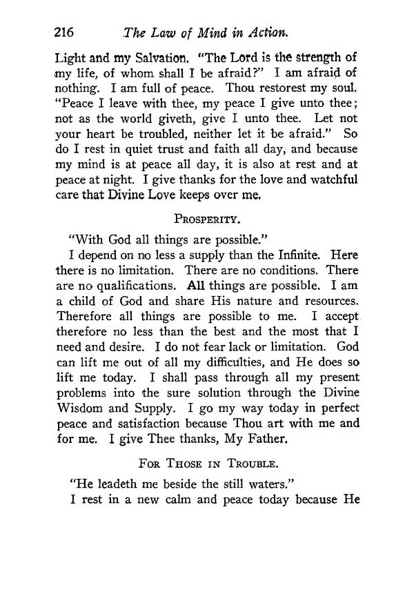 I depend on no less a supply than the Infinite. Here there is no limitation. There are no conditions. There are no qualifications. All things are possible. I am a child of God and share His nature and resources. Therefore all things are possible to me. I accept therefore no less than the best and the most that I need and desire. I do not fear lack or limitation. God can lift me out of all my difficulties, and He does so lift me today. I shall pass through all my present problems into the sure solution through the Divine Wisdom and Supply. I go my way today in perfect peace and satisfaction because Thou art with me and for me, I give Thee thanks, My Father.