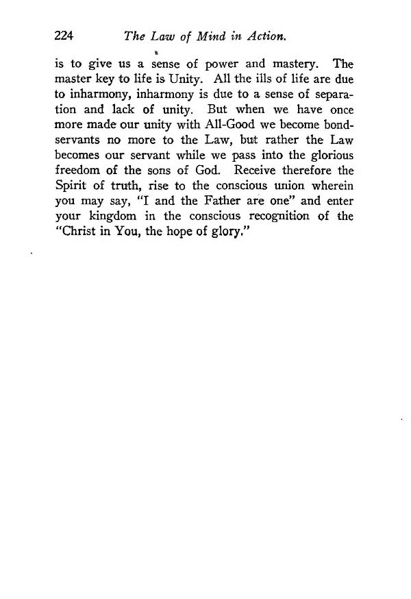 Method of Reading and Study - Metaphysics - The One Law - How to Use the Law - Spirit - Creative Mind in the Individual - Creative Mind in the Universal - Man ~ Master on the Planet - Matter, or Thought in Form - The Creative Word - The Outer and the Inner Universe - The Infinite Self - Law of Attraction - Choosing the Law - Feeling and Emotions - Instinct to Create - Our Immaculate Conceptions - Intensified Consciousness - Is Evil a Power? - The Thing I Fear - Nothing Matters - Courage Regained - Creative Imagination - One-Pointedness - Faith, An Attitude of Mind - Mental Poise - The Will To Win - Creating Atmospheres and Prosperity - The Personal Spirit - Intuition and Ideation - Ultimate Reality & the Fatherhood of God - The Supreme Affirmation - Use of Formulas - How to Help Others - Whom to Treat - How Long to Treat - What Kind of Cases to Be Treated - My Good Night Prayer - Contents -