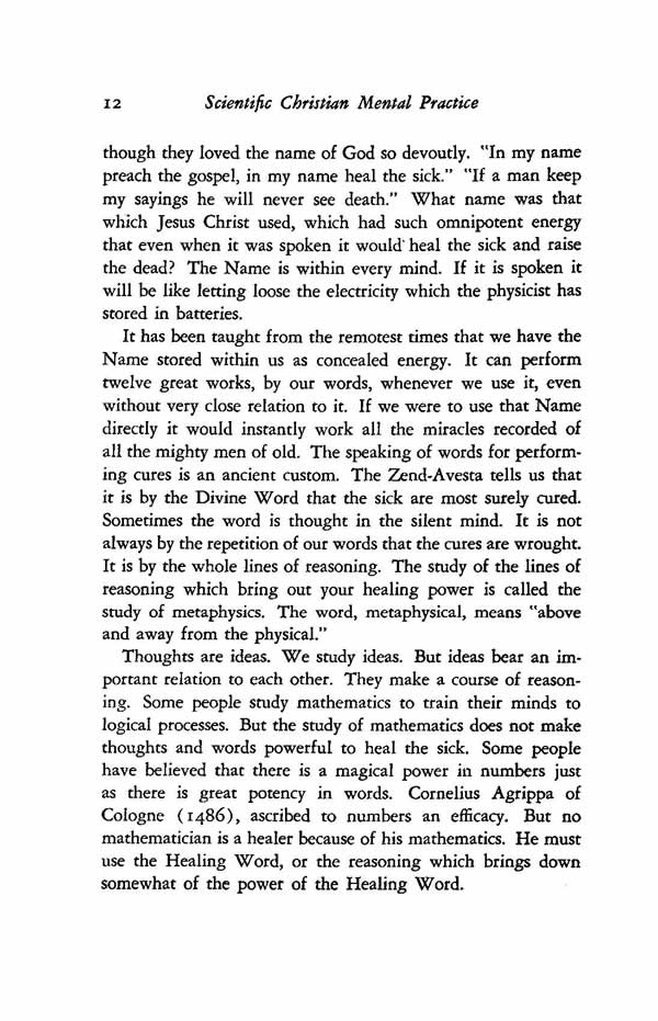 It has been taught from the remotest times that we have the Name stored within us as concealed energy. It can perform twelve great works, by our words, whenever we use it, even without very close relation to it. If we were to use that Name directly it would instantly work all the miracles recorded of all the mighty men of old. The speaking of words for performing cures is an ancient custom. The Zend-Avesta tells us that it is by the Divine Word that the sick are most surely cured. Sometimes the word is thought in the silent mind. It is not always by the repetition of our words that the cures are wrought. It is by the whole lines of reasoning. The study of the lines of reasoning which bring out your healing power is called the study of metaphysics. The word, metaphysical, means "above and away from the physical."