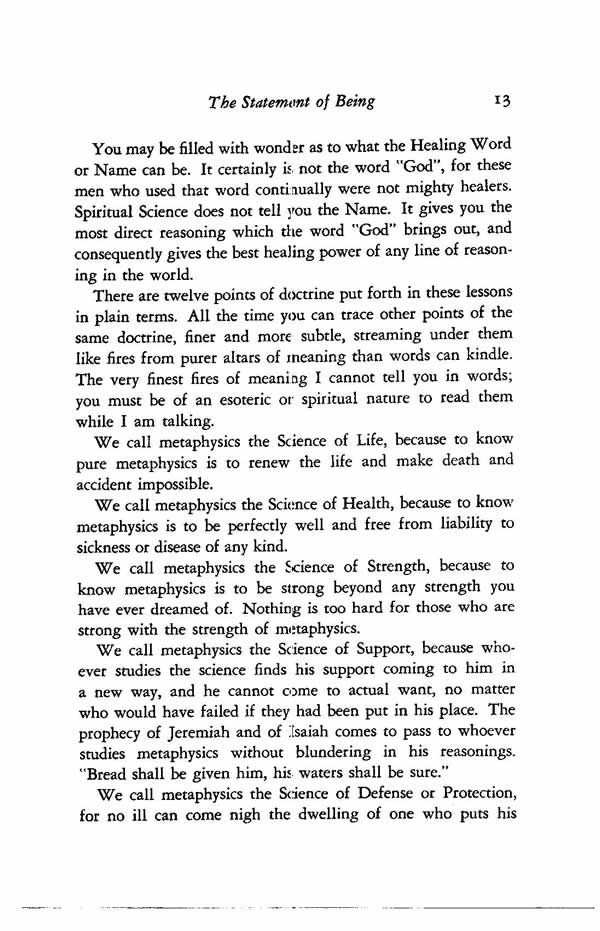 You may be filled with wonder as to what the Healing Word or Name can be. It certainly is not the word "God", for these men who used that word continually were not mighty healers. Spiritual Science does not tell you the Name. It gives you the most direct reasoning which the word "God" brings out, and consequently gives the best healing power of any line of reasoning in the world.